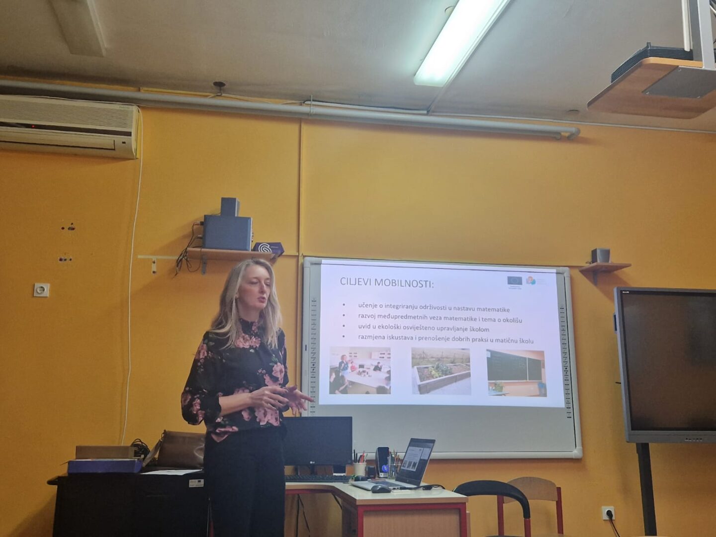 Na Županijskom stručnom vijeću učitelja matematike održanog 11. studenog 2025. učiteljica Martina Strelar predstavila je iskustva i rezultate sudjelovanja u Erasmus+ projektu ‘’Be green, be well’’ u OŠ Danila Lokarja u Ajdovščini. Kroz izlaganje je istaknula važnost povezivanja ekoloških sadržaja, održivog načina života i mentalnog zdravlja učenika s nastavom matematike.