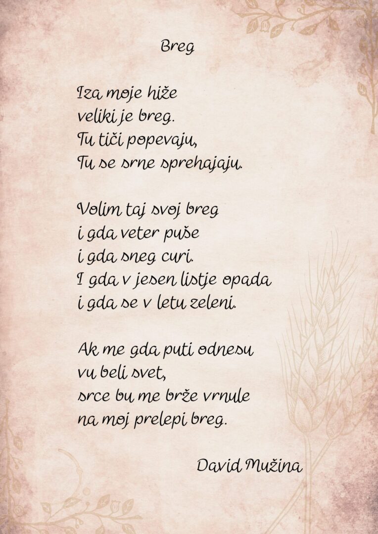 Pjesmom „Breg“ naš je učenik David Mužina zauzeo 1. mjesto u kategoriji literarnih radova od 1. do 4. razreda. Čestitamo Davidu i zahvaljujemo mu što je svojim radom istaknuo našu školu. Njegov uspjeh ponos je svima nama i poticaj za daljnje stvaralaštvo!