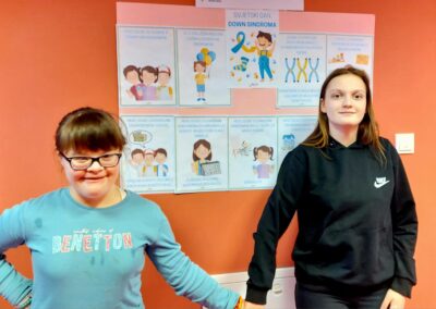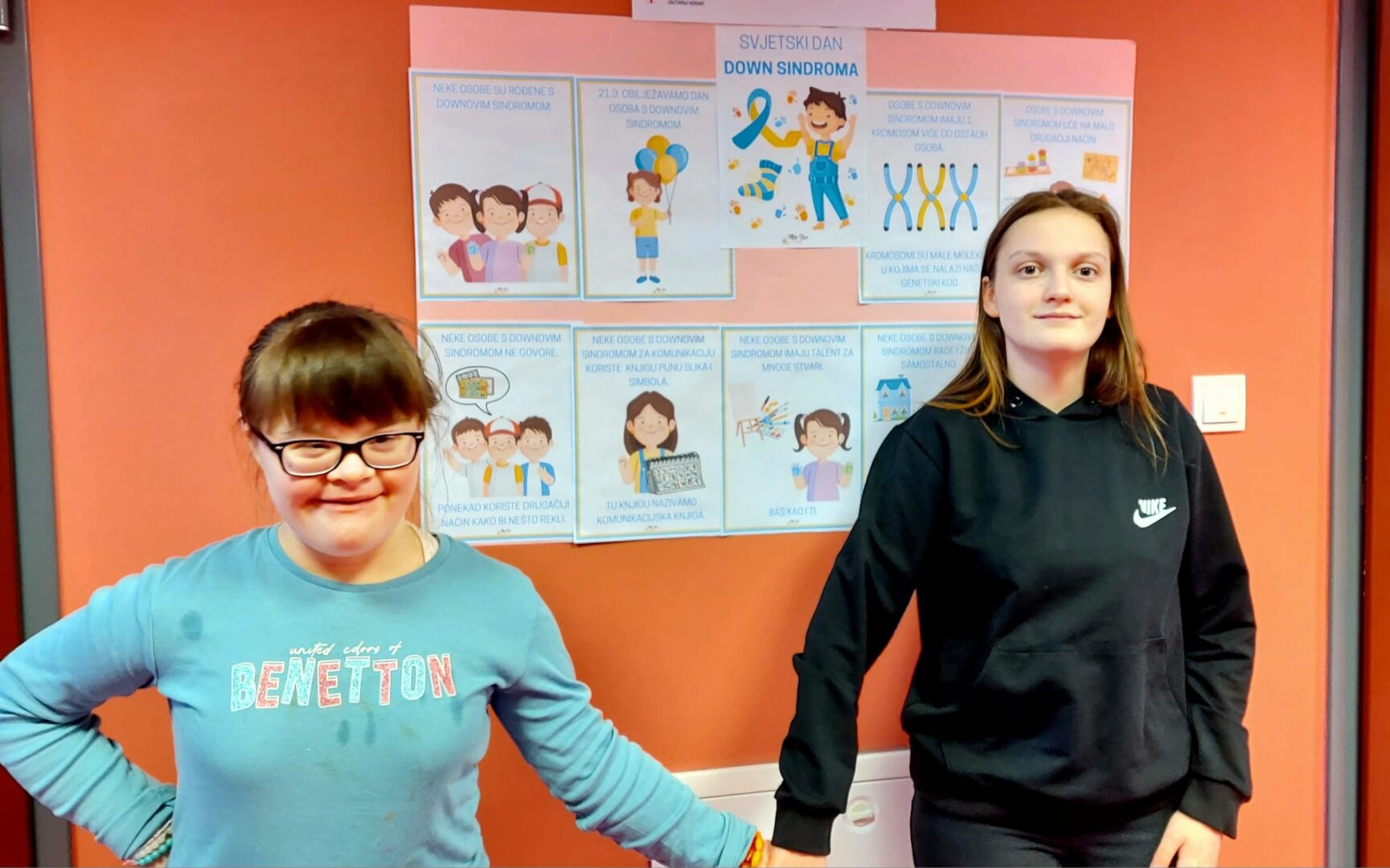 Osobe s Down sindromom imaju jedan kromosom više na 21. paru kromosoma, i zato se još naziva i trisomija 21. Zbog toga uče na drukčiji način i treba im više vremena za učenje. Neke osobe s Down sindromom ne govore pa koriste znakovni jezik ili komunikacijske knjige. Neke osobe s Down sindromom mogu raditi i živjeti samostalno ili uz podršku zajednice. Učenici su naučili da smo svi različiti, ali jednako vrijedni.