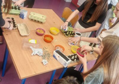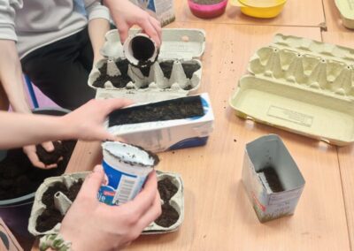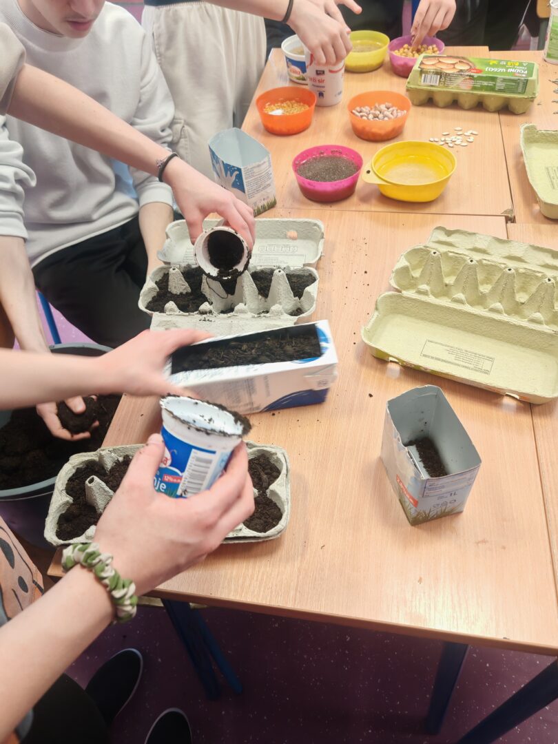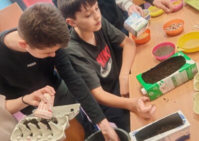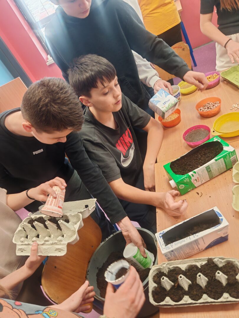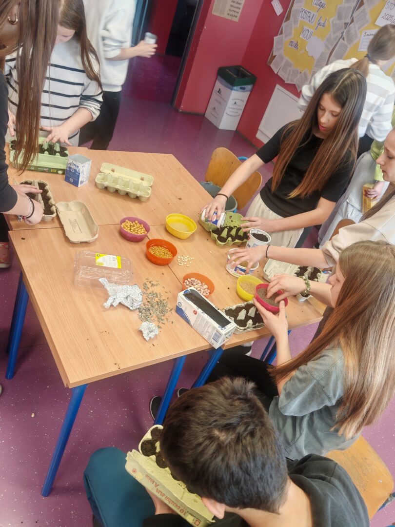 Drugoga dana uslijedilo je sijanje. Učenici su naklijale sjemenke posijali u reciklirane posude izrađene od ambalaže poput tetrapaka od mlijeka i kutija za jaja. Na taj su način povezali učenje o biljkama s važnošću očuvanja okoliša, recikliranja i ponovne uporabe materijala.
