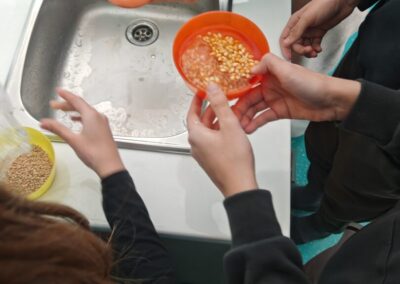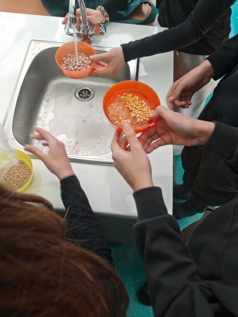 Prvoga dana učenici su močili različite vrste sjemenki, poput slanutka, suncokreta i graha. Promatrali su kako sjemenke upijaju vodu i razgovarali o uvjetima potrebnima za njihov rast – vodi, toplini i zraku.