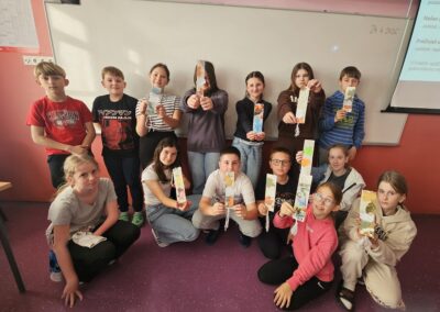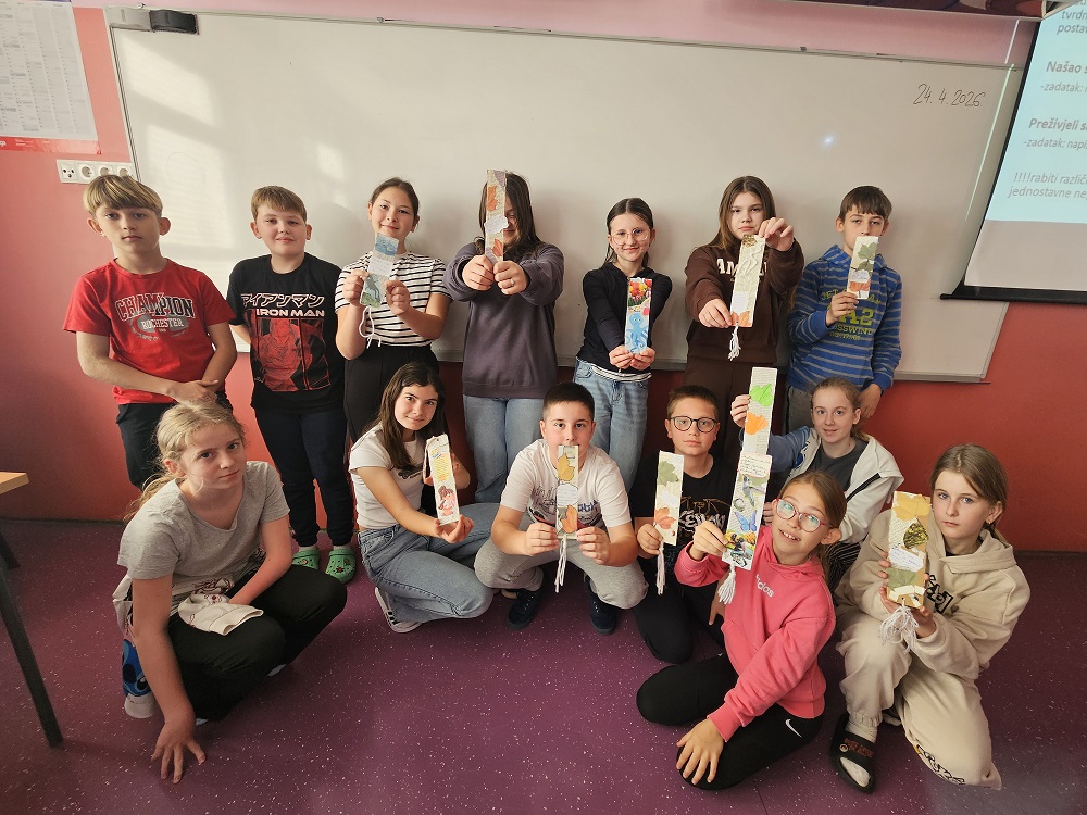 U sklopu školskog Tjedna očuvanja okoliša, koji se provodi u okviru našeg Erasmus projekta, učenici 5. razreda na satu Hrvatskog jezika sudjelovali su u kreativnoj radionici izrade straničnika od recikliranih materijala. Aktivnost je povezala razvoj zelenih navika (povodom Dana planeta Zemlje 22. travnja) s obilježavanjem Dana hrvatske knjige (22. travnja) i Svjetskog dana knjige i autorskih prava (23. travnja).