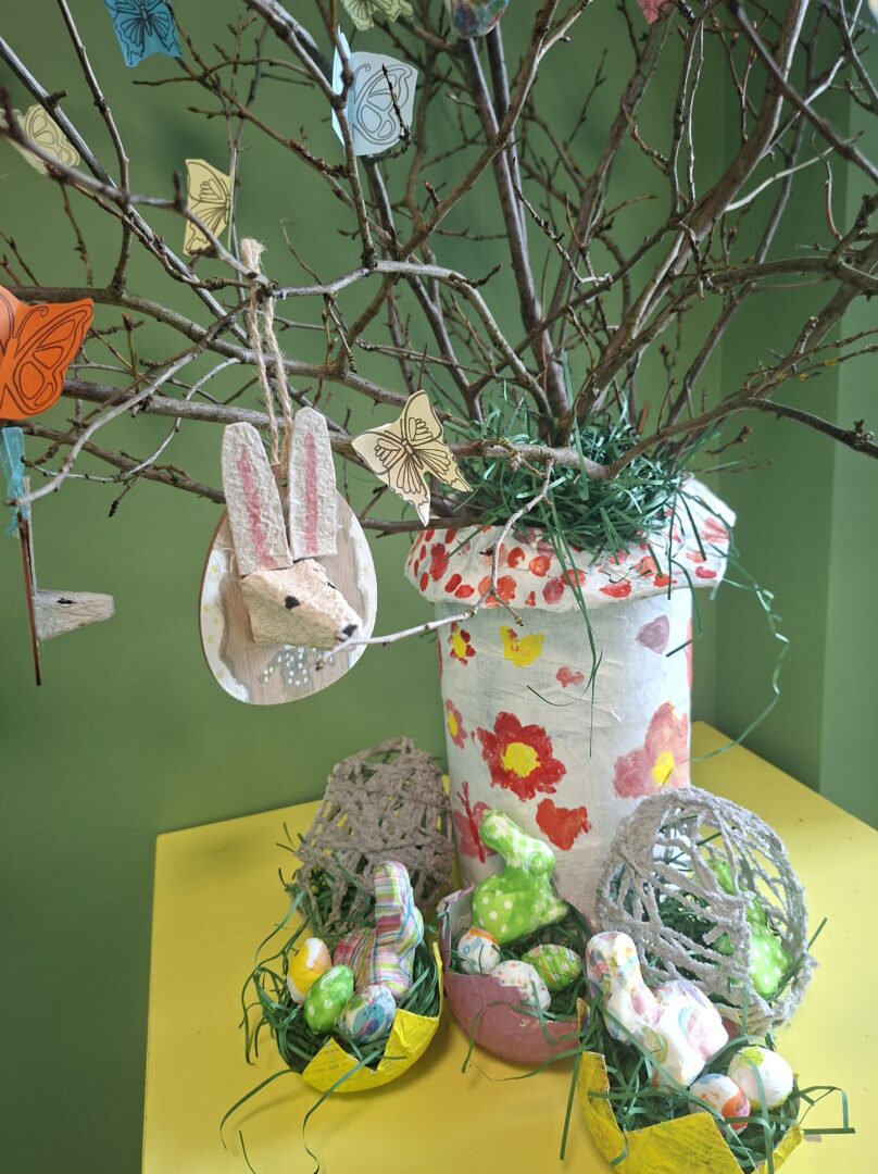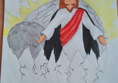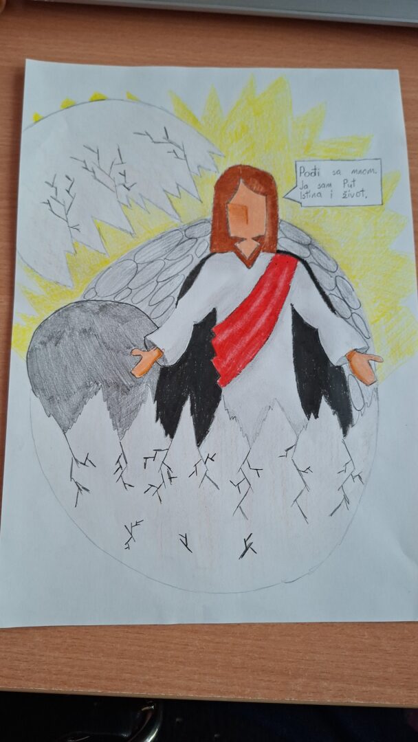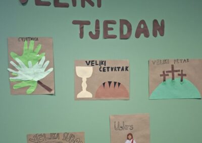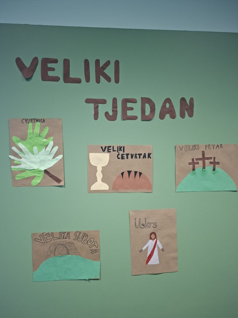 Kroz mjesec ožujak vjeronaučna grupa pripremala se za Veliki tjedan i Uskrs. Učenici su kaširali balone od kojih su napravili mala jaja/ gnijezda za jaja od stiropora. Jaja od stiropora ukrašavali su salvetama i upoznali se sa dekupaž tehnikom. Naučili smo i tehniku izrade košarica od ljepila i vune. Osim toga koristili smo se recikliranjem kutija od jaja i napravili zečiće. Učenici su iz tjedan u tjedan približavanju Uskrsa naučili kako od nečeg iskorištenog napraviti nešto novo.